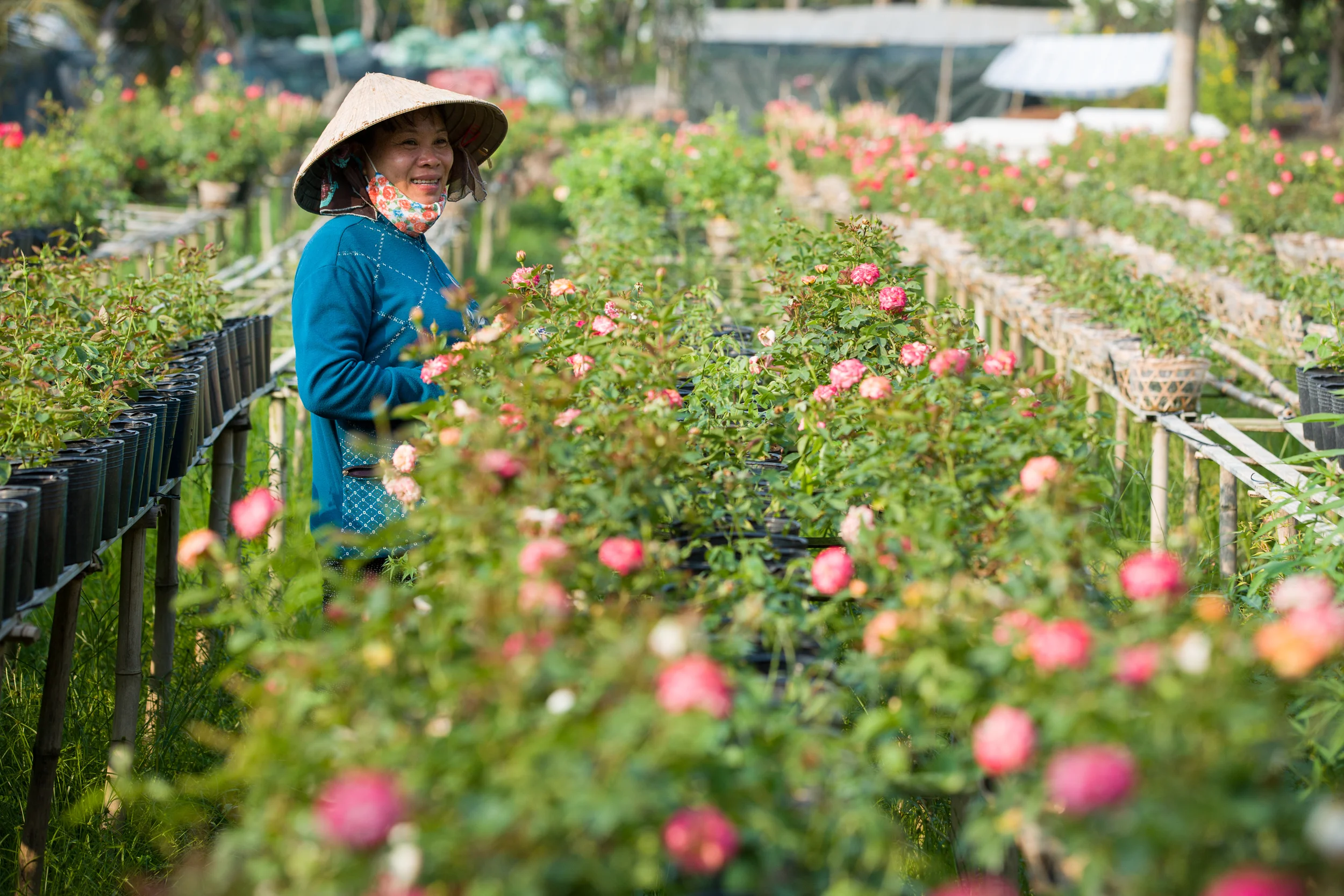 This is Hang, and she's 42. She spends her days tending roses and other flowers at this nursery about 3 kilometres outside Sa Dec. "I used to plant rice," she says, "but my brother was working here on the flowers and he told me I'd make a lot more money. So I switched." She says the work is not bad for the pay, and is much less physically taxing than planting and harvesting rice.