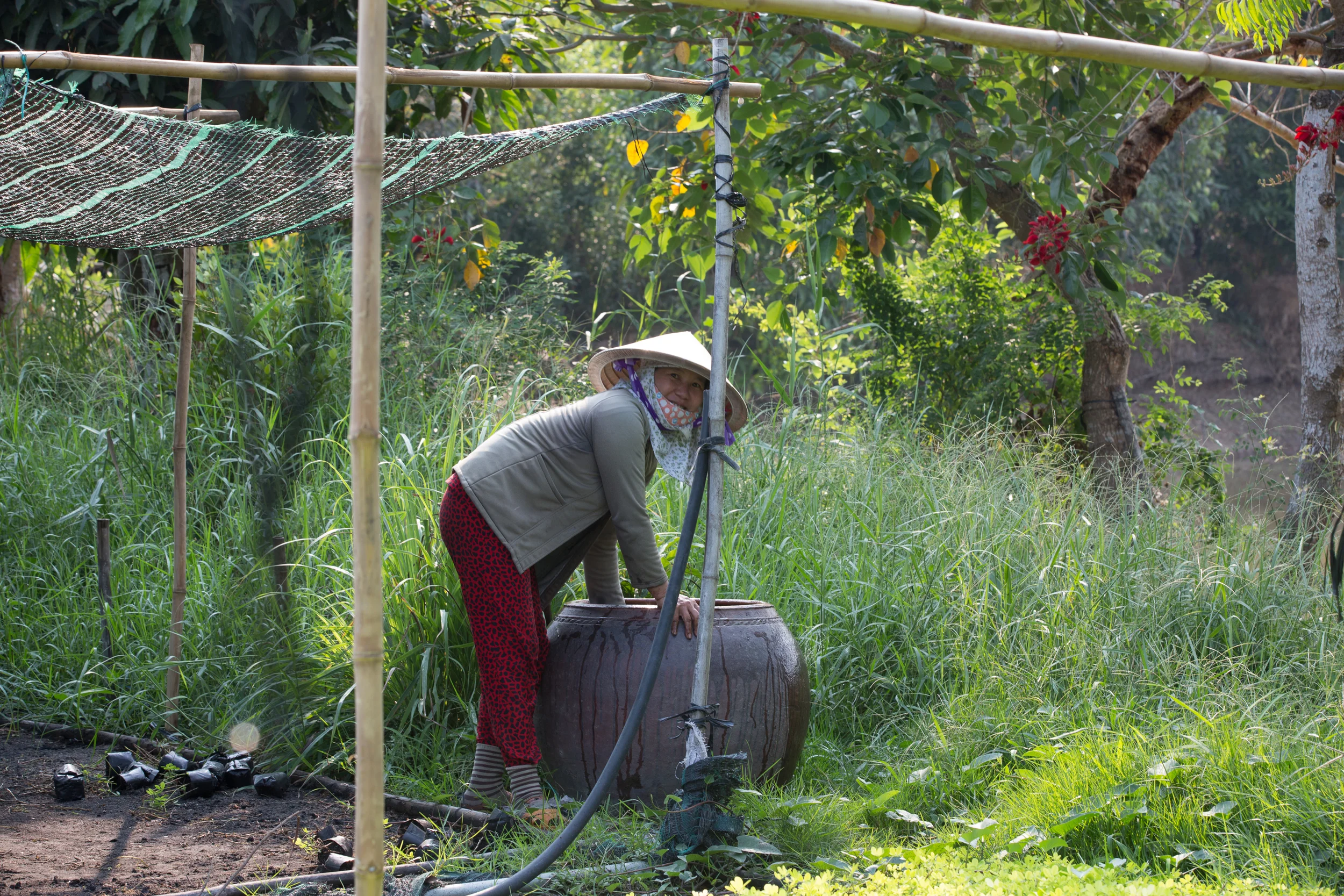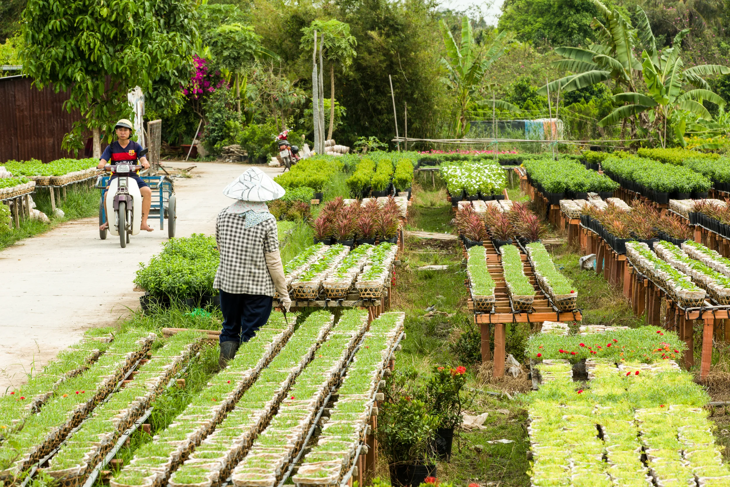 She's tending and selling ornamental grass. She says she works from about 630 am to 6 pm, sometimes longer in the high season. Loan says she really likes being outside for her work, and loves the rich soil, nourished by canals that spread water from the Mekong. "The soil has been good for the ten years I've been working here, and I think it will stay that way."