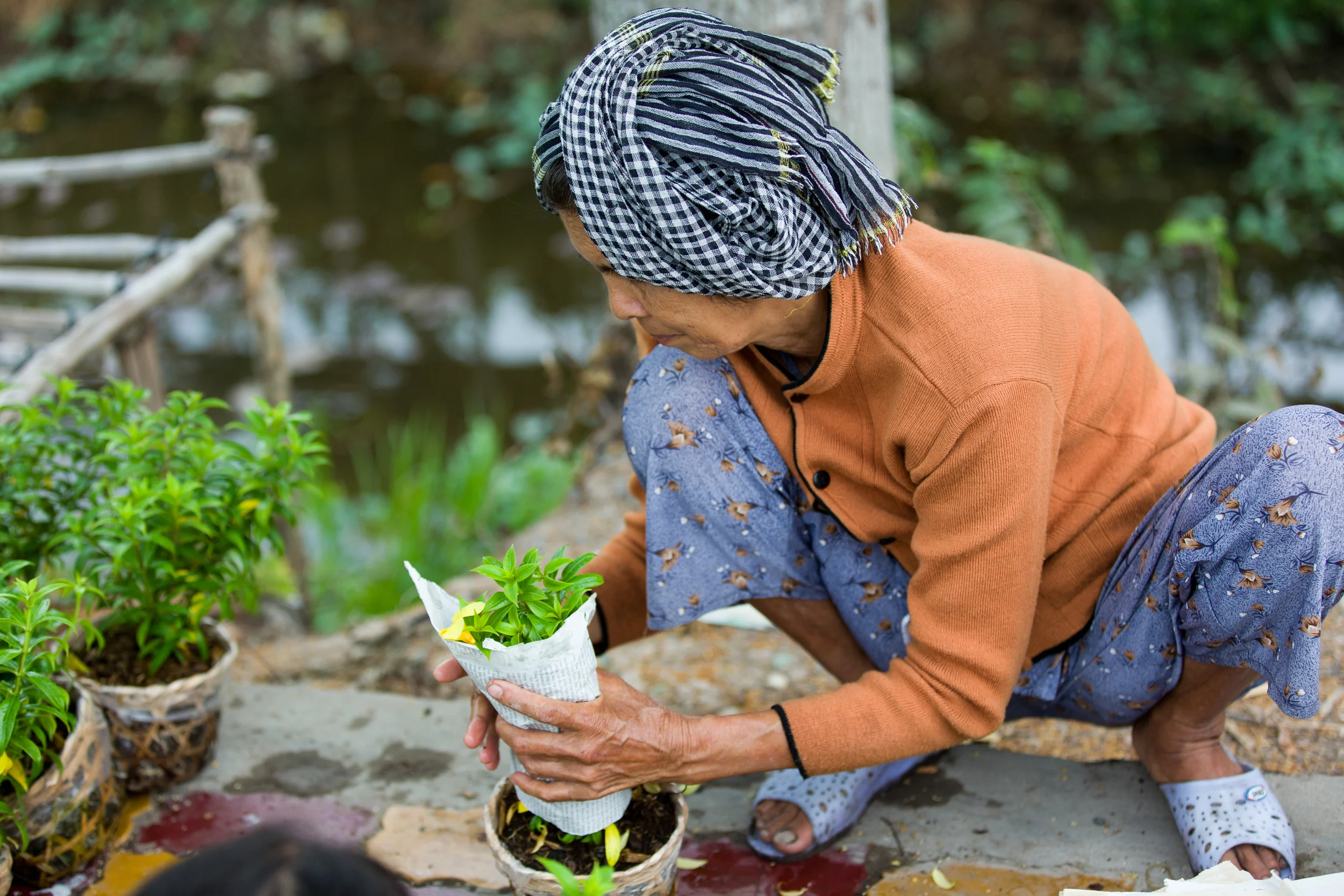 Manh grew up in wartime, and she didn't have the chance to go to school. She can't read or write, but she can certainly run a business. Each day she prepares about 100 plants and places them out on the road for sale. She sells every one of them. Each sapling is worth 5000 VND, or about $0.22 cents. "It doesn't make you rich, but it pays the bills," she says. Much of the money goes back into the business.