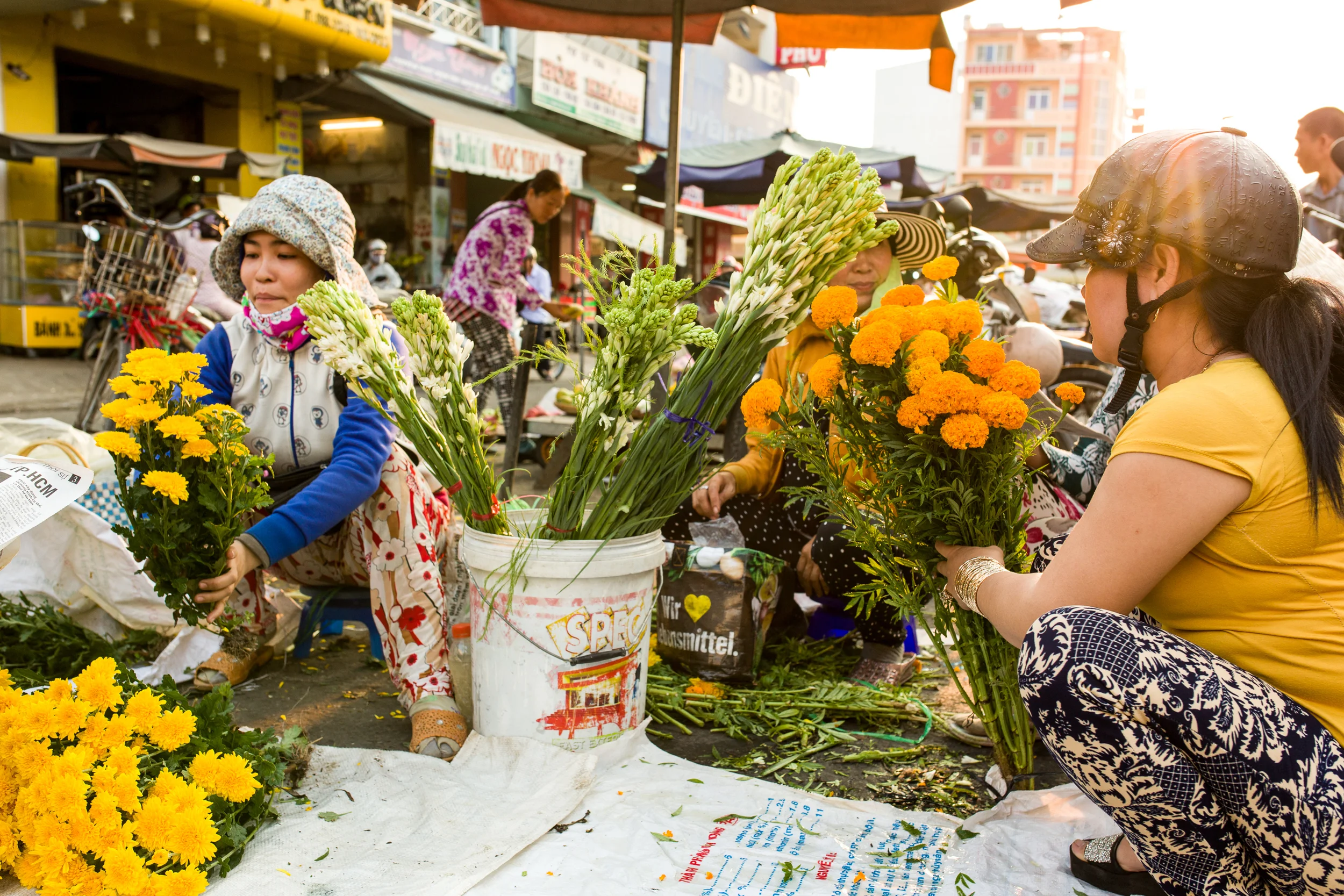 On a parallel road a few minutes away, we stop to talk with one more flower seller. She's Manh.