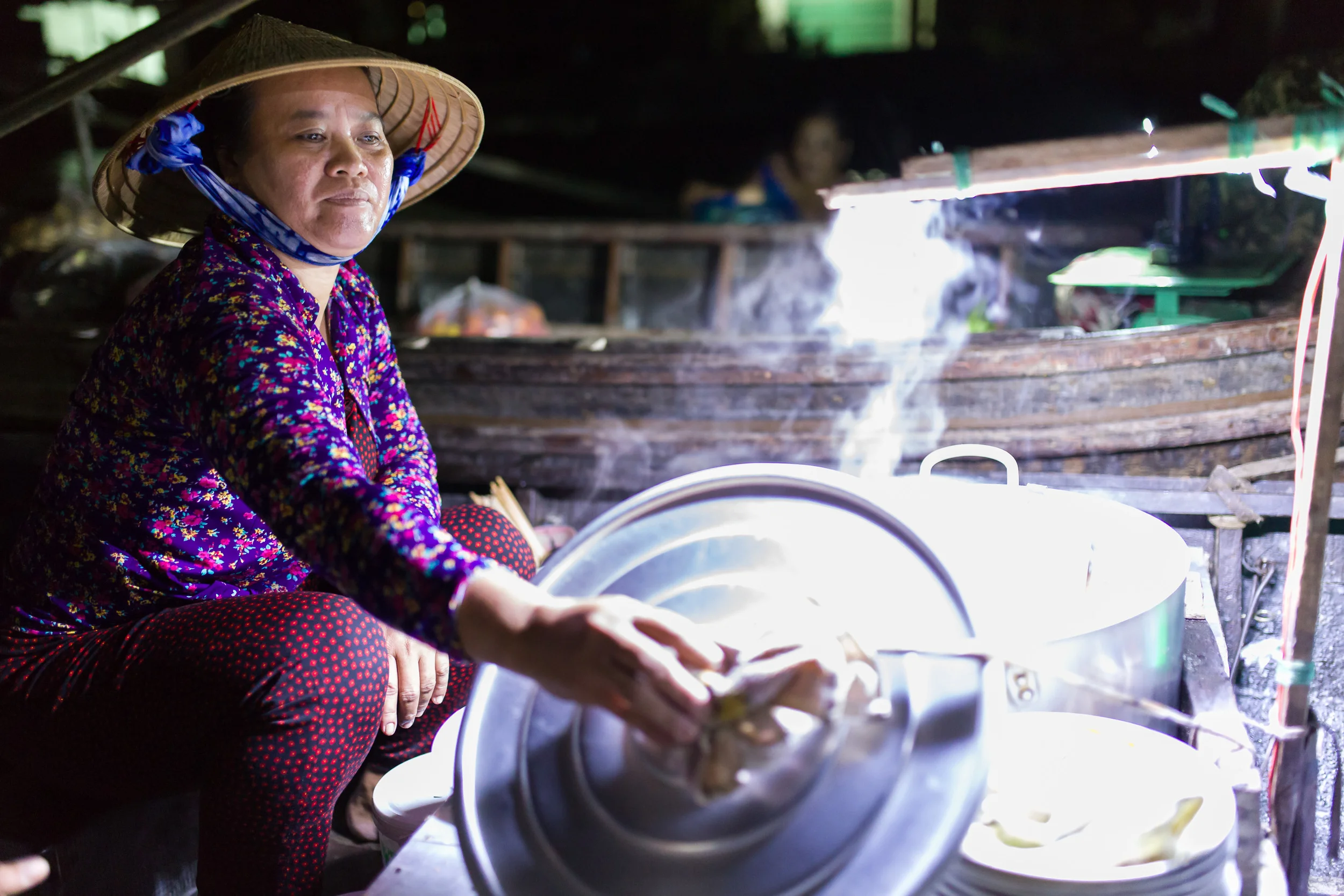 Kim Long provides sustenance for the vendors - steaming bowls of noodle soup. "I wake up at 230 every morning to cook," she says. "My husband helps me carry the heavy pot to the boat, and I paddle up the river to work." She's been doing this work for two years.