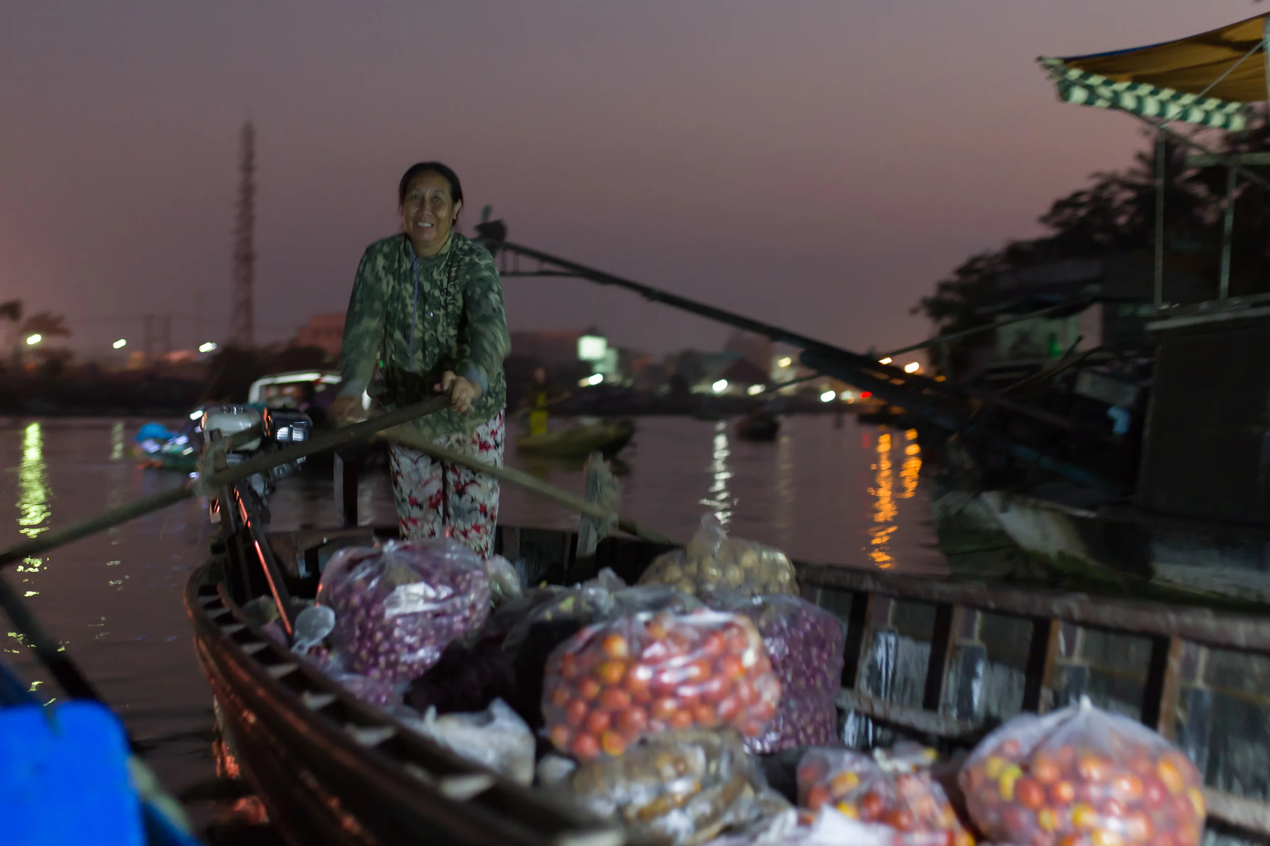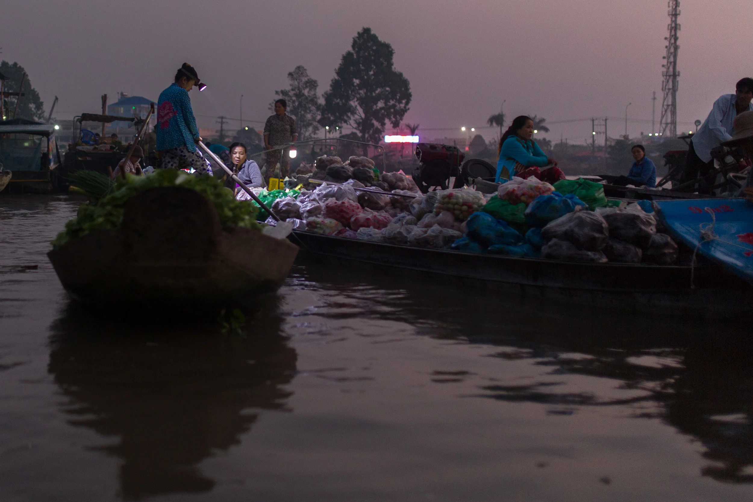 It's 5 am at the Phong Dien floating market, on a Mekong tributary near Can Tho, Vietnam. Vendors here have already been working for hours.